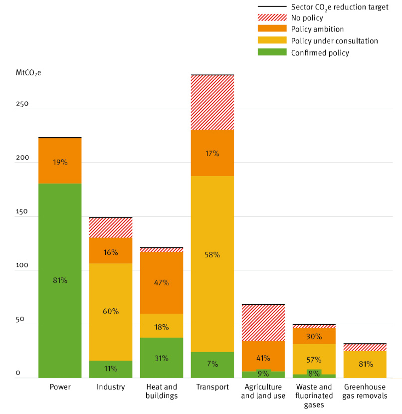 On this chart, green shows the carbon emissions that the government already has a plan for. Yellow is where there are ideas kicking around that haven’t become law yet. Orange is where the government has said it’s going to do something but hasn’t said what, and the striped areas are where there’s no plan at all.