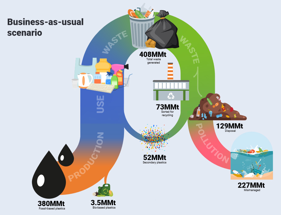 The plan is summed up visually in two rather neat graphics. Here’s a summary of where we are now: vast quantities of fossil fuels going into mostly single-use plastics that are then thrown away. A small percentage is recycled. Most of it is mismanaged and ends up as plastic pollution.