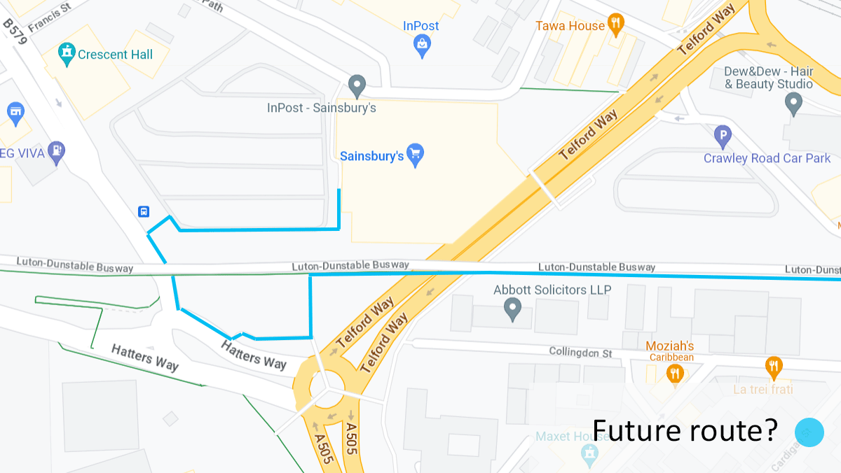 3 – Anyone who’s familiar with Luton will know the Telford Way footbridge, as it makes for a kind of iconic roundabout. But why didn’t we add a spur from it when the busway was built?