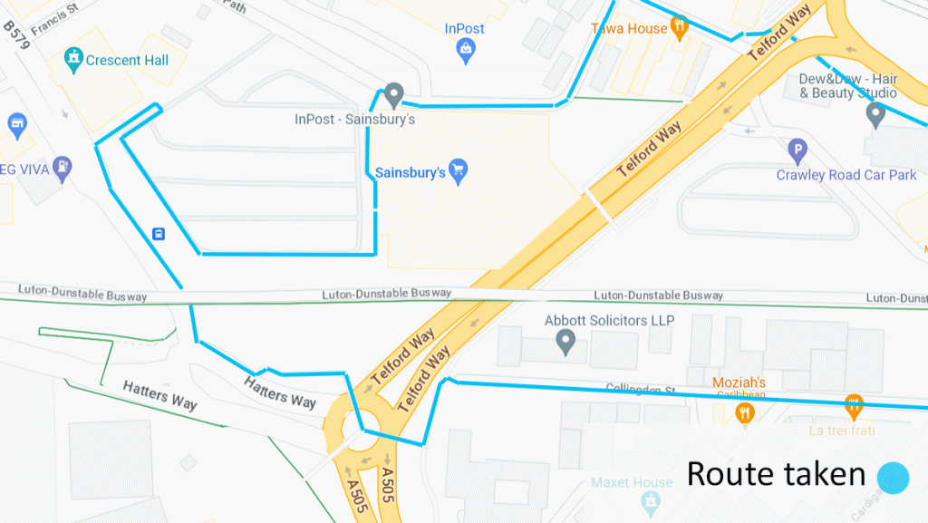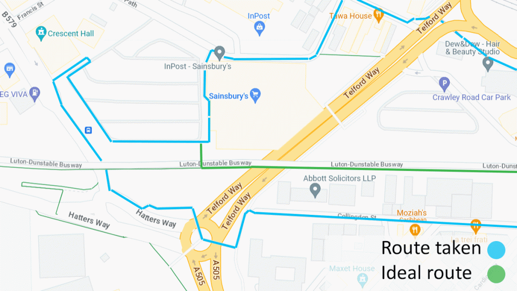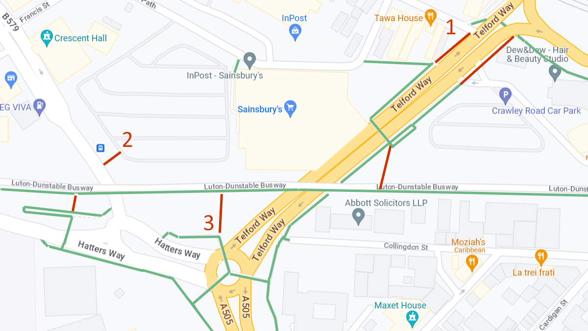 Here’s the good news though, and another reason why it’s a good case study. Luton Borough Council have done some research into journeys through the town on foot and by bike. They have identified key corridors for active transport, and where they don’t work. This particular point is one of those routes, and there are plans to improve it.