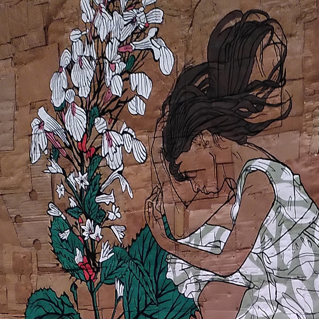 The next room features Andrea Bowers, who is an environmental activist as well as an artist. At the centre of the room is a ‘memorial’ to a grove of trees that she was unable to protect. She climbed a tree along with fellow activists, was arrested and the trees were cut down. The memorial is made from wood chips left behind, suspended with climbing gear. It remembers the trees and the protest, a reflection on what could not be saved. That theme of grief continues around the room, with large paintings marking extinct birds and plants, painted on ‘canvases’ made of cardboard scraps.
