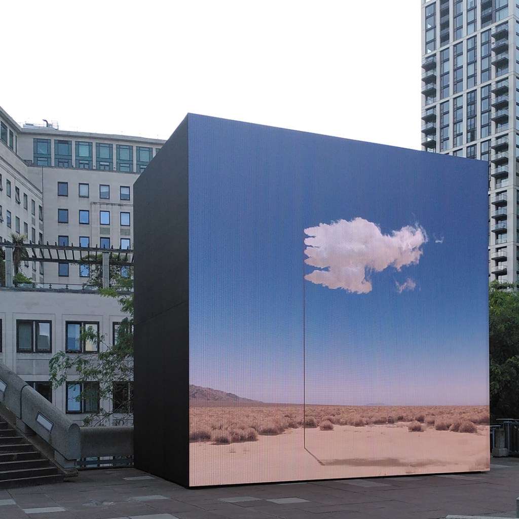 There’s more to discover around the site, including the easily missed recycled stone mosaics in the roof garden next door on the Queen Elizabeth Hall (the garden is one of the area’s hidden gems anyway). I also liked Surrender (flag) 2023, by the Irish artist John Gerrard. It’s a video projection of a white flag made of vapour fluttering over a desert landscape. It looks like pollution, but its form “looks to the future, towards ideas of stoppage, parlay and submission to larger planetary realities.” The screen is a stone’s throw from Shell’s headquarters, which made me think about Shell running up the white flag and announcing their surrender to the logic of nature and survival.