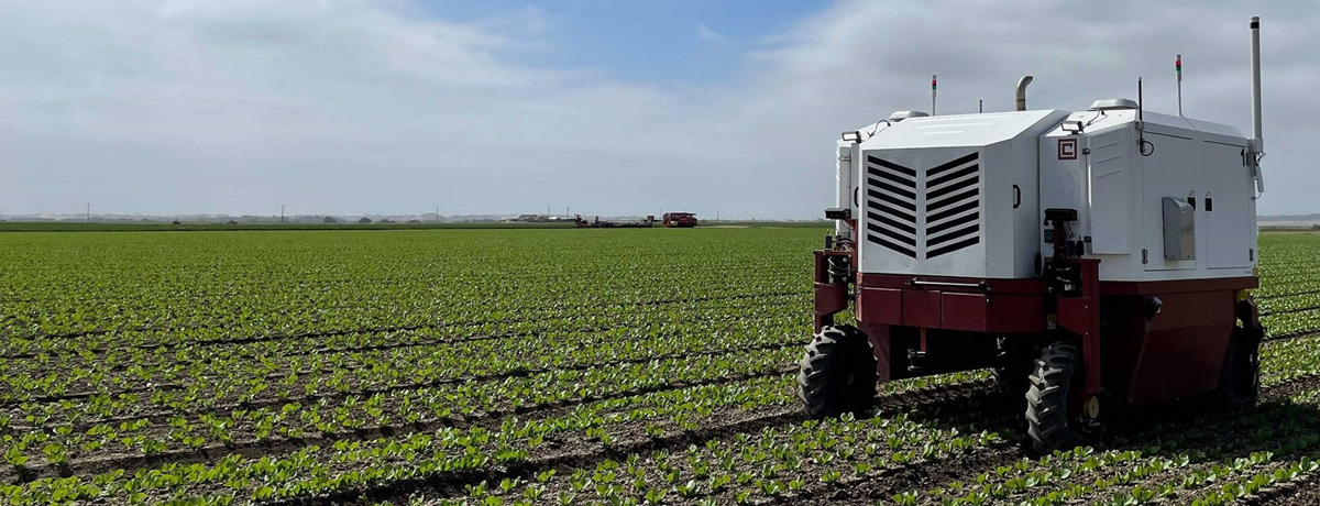 This is a robot weeding machine from Carbon Robotics. It trundles autonomously up and down the fields, reading the crops with bright lights and frying weeds with highly targeted lasers. It can work 24 hours a day, zapping 10,000 weeds an hour in fields of 40 different crops.