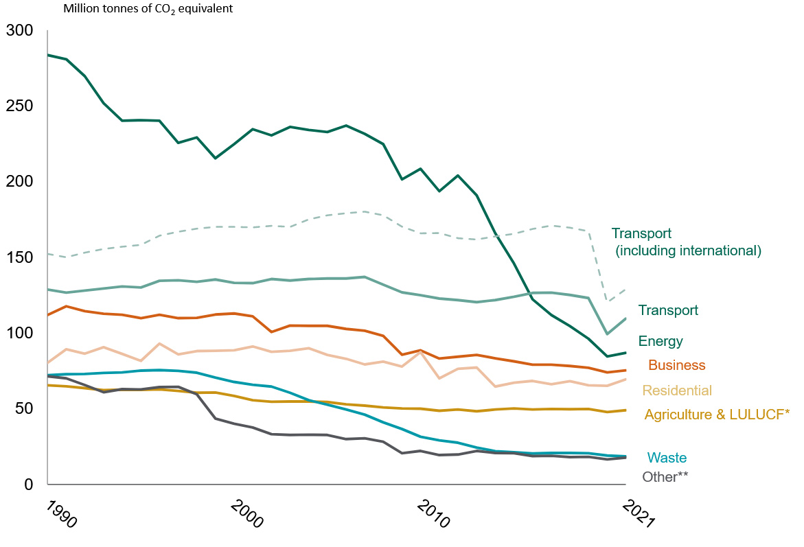 Transport has been the biggest source of carbon emissions since 2017, ticking along virtually unchanged for thirty years – until the pandemic. 2021’s statistics are still reflecting that and it’s too early to tell if there’s been a permanent dip. However that turns out, it’s the next big thing on the to-do list.