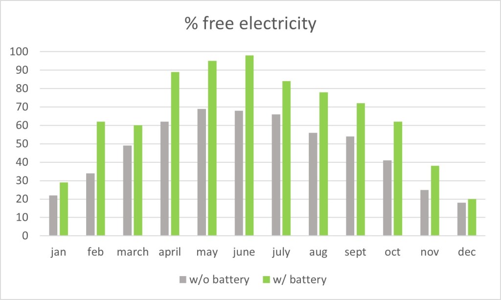 The graph below shows the amount of free electricity we get from the solar panels, before and after installing a battery.
