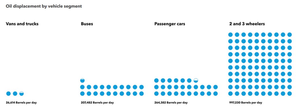 China leads the way here with 201 million electric two-wheelers, most of them mopeds, which have become a very popular form of cheap urban transport. Add in the growing number of electric three-wheelers that I’ve discussed before, in India in particular, and the numbers considerably outweigh the impact of electric passenger cars so far.