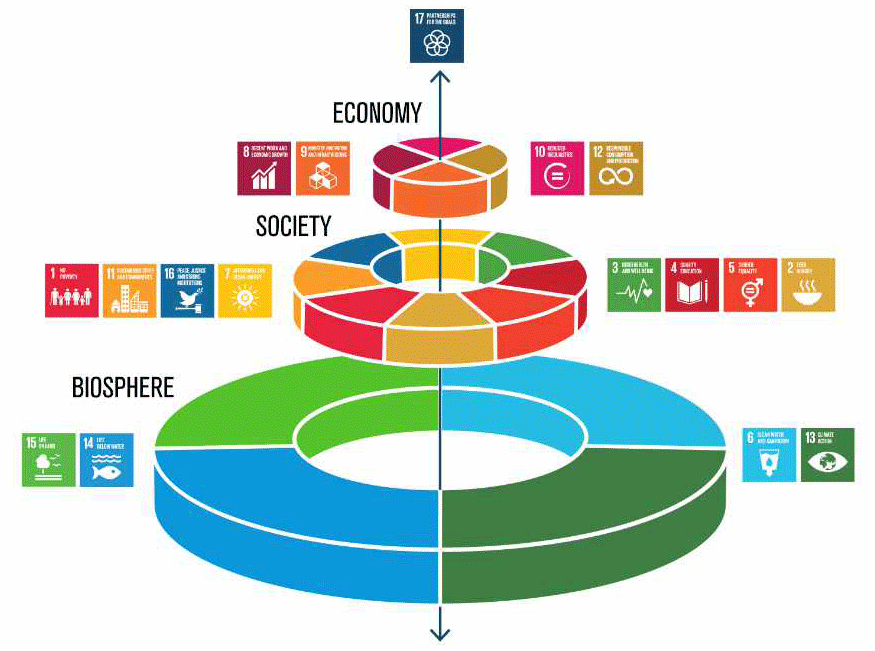 Instead, we could stack them like a wedding cake. Economic goals such as sustainable production, good work or economic growth all depend on a functioning society. Social goals such as ending hunger or providing healthcare and education depend on environmental stability.