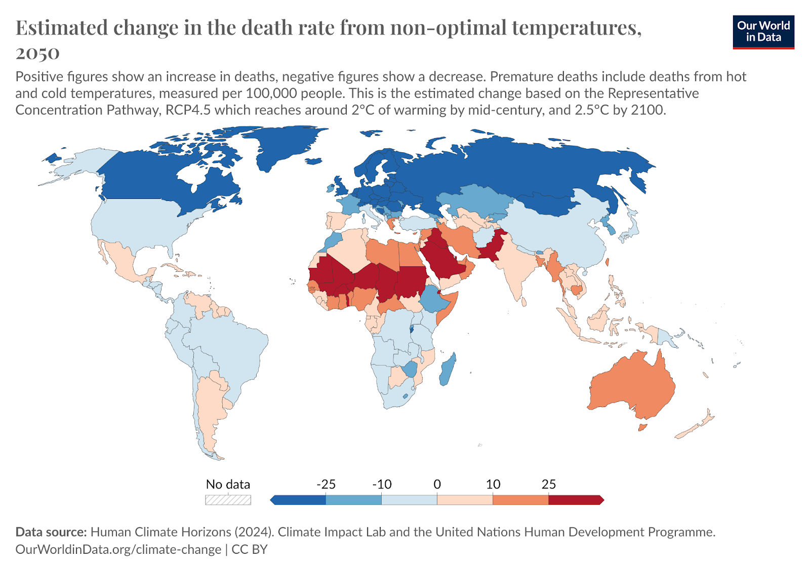 The map above follows a similar pattern to other climate impacts, such as extreme heat, falling crop production or uninhabitability. Emissions go into a shared atmosphere, and the damage can fall on those least responsible.