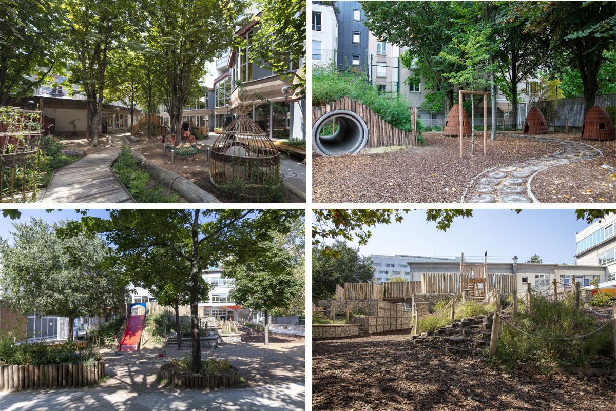 Many Paris schools have playgrounds like the ones I encounter sometimes in London or Luton, little more than flat concrete or tarmac yards. “Adieu bitume” says the Oasis project, and digs this up. Tarmac absorbs heat and water runs off it during heavy rainfall, increasing the risk of flash flooding. They add grass, sand or bark chips instead, stepping stones, decorative walls and a variety of surfaces. They also vary the terrain, unflattening it and adding little hills and dips, embankments and ramps. These cleverly incorporate drainage systems to manage stormwater, but they’re also play features. They’re designed to get children improving their motor skills in ways that aren’t possible on flat concrete, through balancing, jumping and climbing.