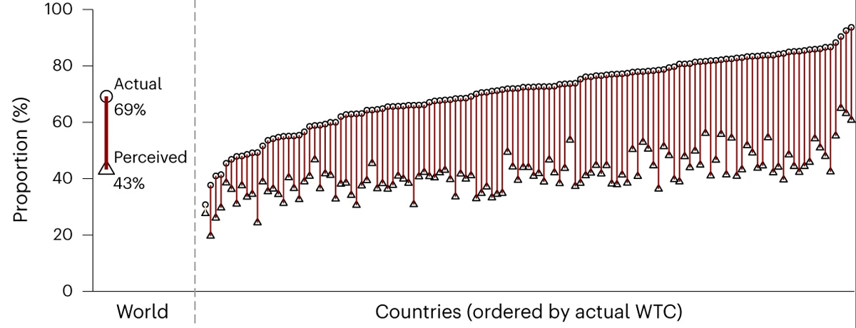 The study maps this gap in actual ‘willingness to contribute’ (WTC) and perceived willingness, across all 125 countries: