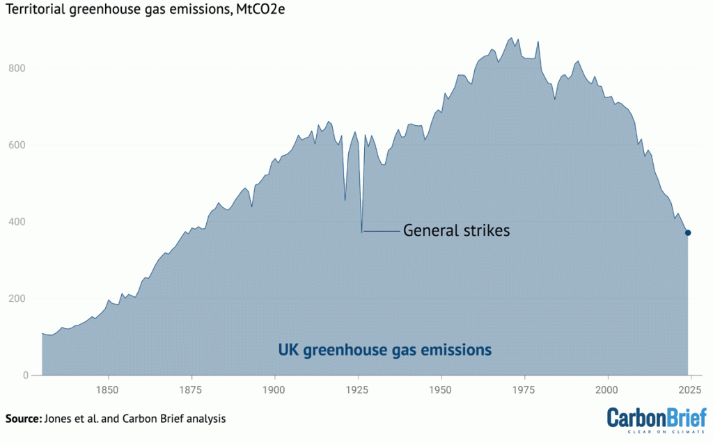Carbon Brief have released another update to what has become one of my favourite graphs: the graph of the UK’s falling carbon emissions. The downward curve continues, past the hiccup of the post-Covid bounce-back and onwards towards zero. As Carbon Brief highlight, emissions in 2024 were the same as the down-spike of the general strike in the 1920s, when coal production paused.