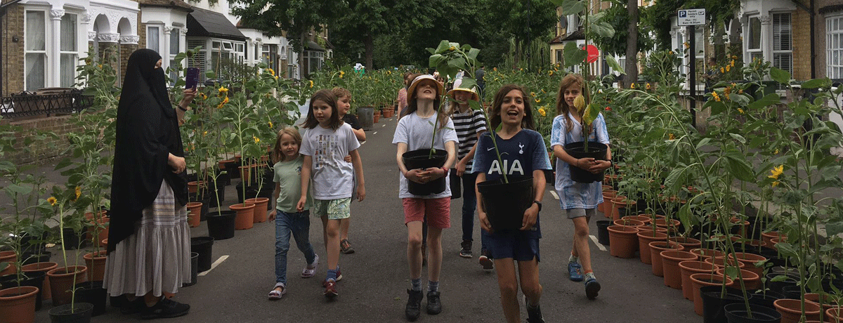 It’s not a straight-forward process. There are set-backs and the stresses of crowd-funding. At one point they need £100,000 to move the project forward, and decide they will sleep on their roof until the money comes in. It’s November and this looks like a terrible idea until the TV news picks up on it. Other stunts include a bid for Christmas number one with a group of school children, and a campaign to grow 10,000 sunflowers to fill the street – both community-based projects that push open people’s idea of what might be possible.