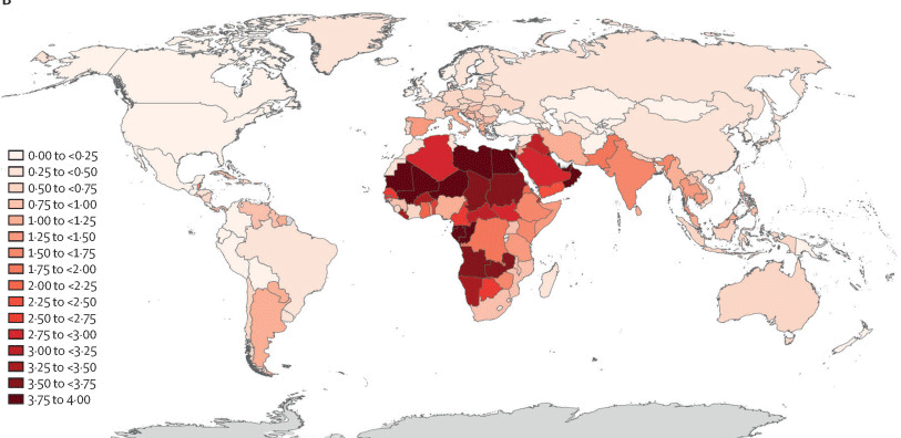 Worldwide, over half a million people died last year from heat related conditions. That’s a number that has risen starkly, partly because the population has been rising, and also because it’s hotter. In the 1990s around 5.9 deaths per 100,000 were heat related. That has increased to 7.2. While everyone is more exposed to heatwave conditions, it is obviously going to be most dangerous in places that are already very hot. Deaths from heat are higher in North Africa and the Middle East.