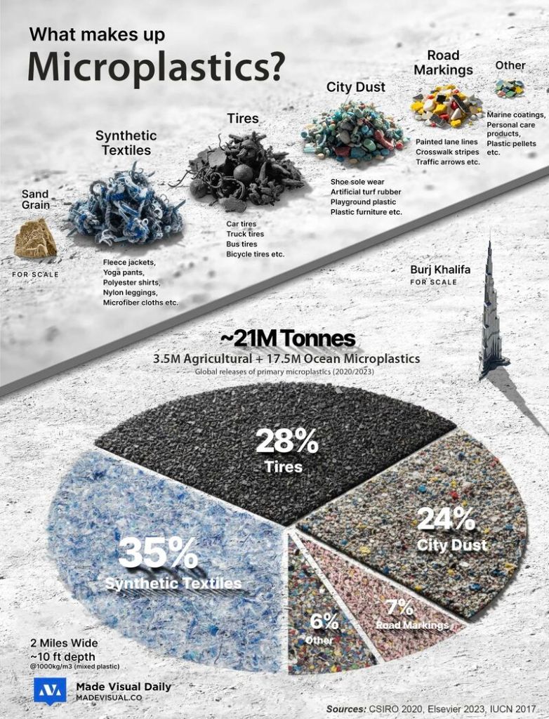 I posted a similar graph last year in a post about road markings, but this one is more visual. What struck me this time is the potential disconnect between the sources of microplastics and general awareness of them. Arguably the most high profile consumer based campaigns have focused on microbeads in cosmetics, which would be a small part of the 6% ‘other’ category. I suppose this is because – like glitter – it’s added on purpose and unnecessarily. Perhaps because it’s in objects we might have in our houses and so it feels personal, something we can responsibility for.