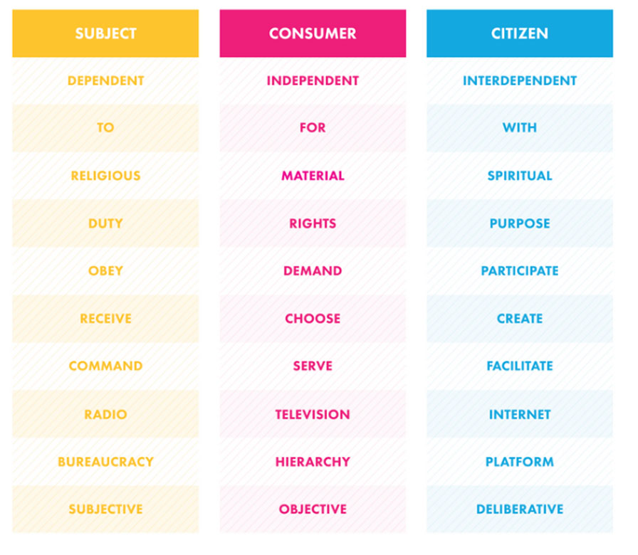 The core argument of his book is that we are in the midst of a long cultural shift from consumers to citizens. We could call it a paradigm shift, or an emerging mindset. It’s already well underway, both driven by and responding to changes in culture and technology.